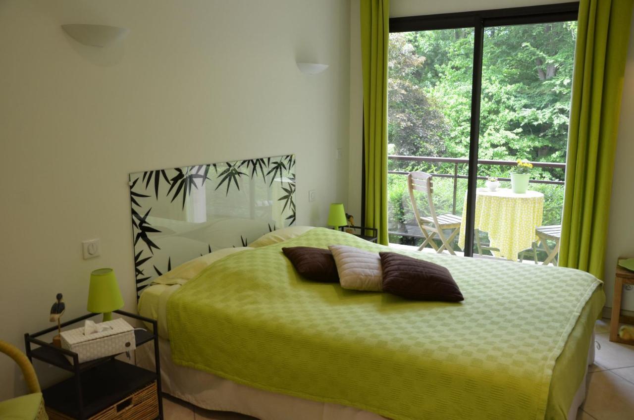 la chambre Les Galets offre une ambiance douce et reposante, dans des tons verts naturels rappelant la forêt du Bois de Cise