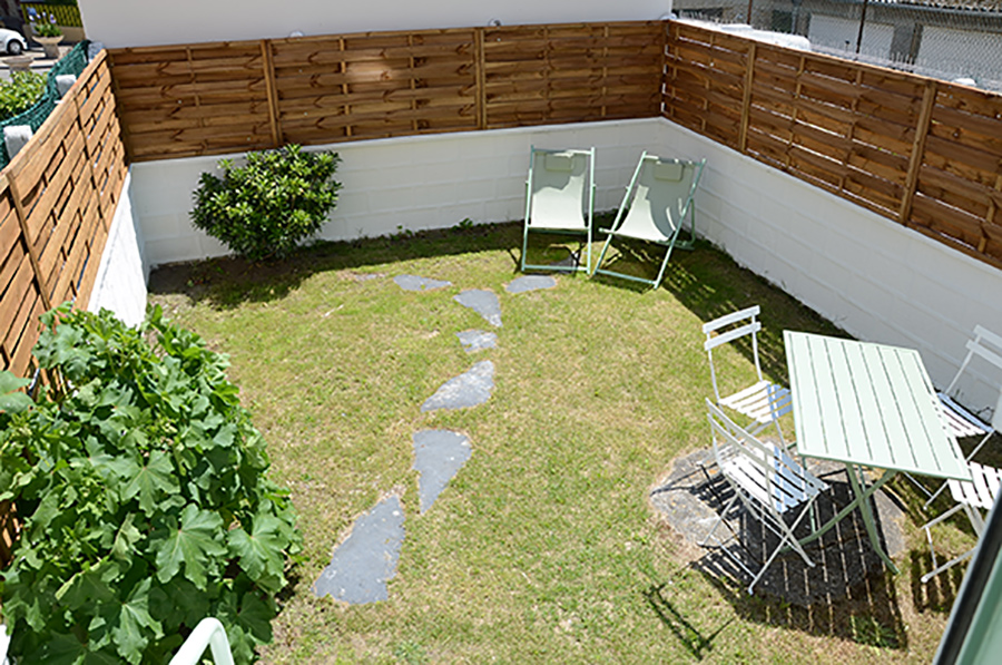 L’appartement est également équipé d’un salon de jardin avec barbecue dans une cour privative, le tout dans un logement traversant offrant une perspective surprenante.