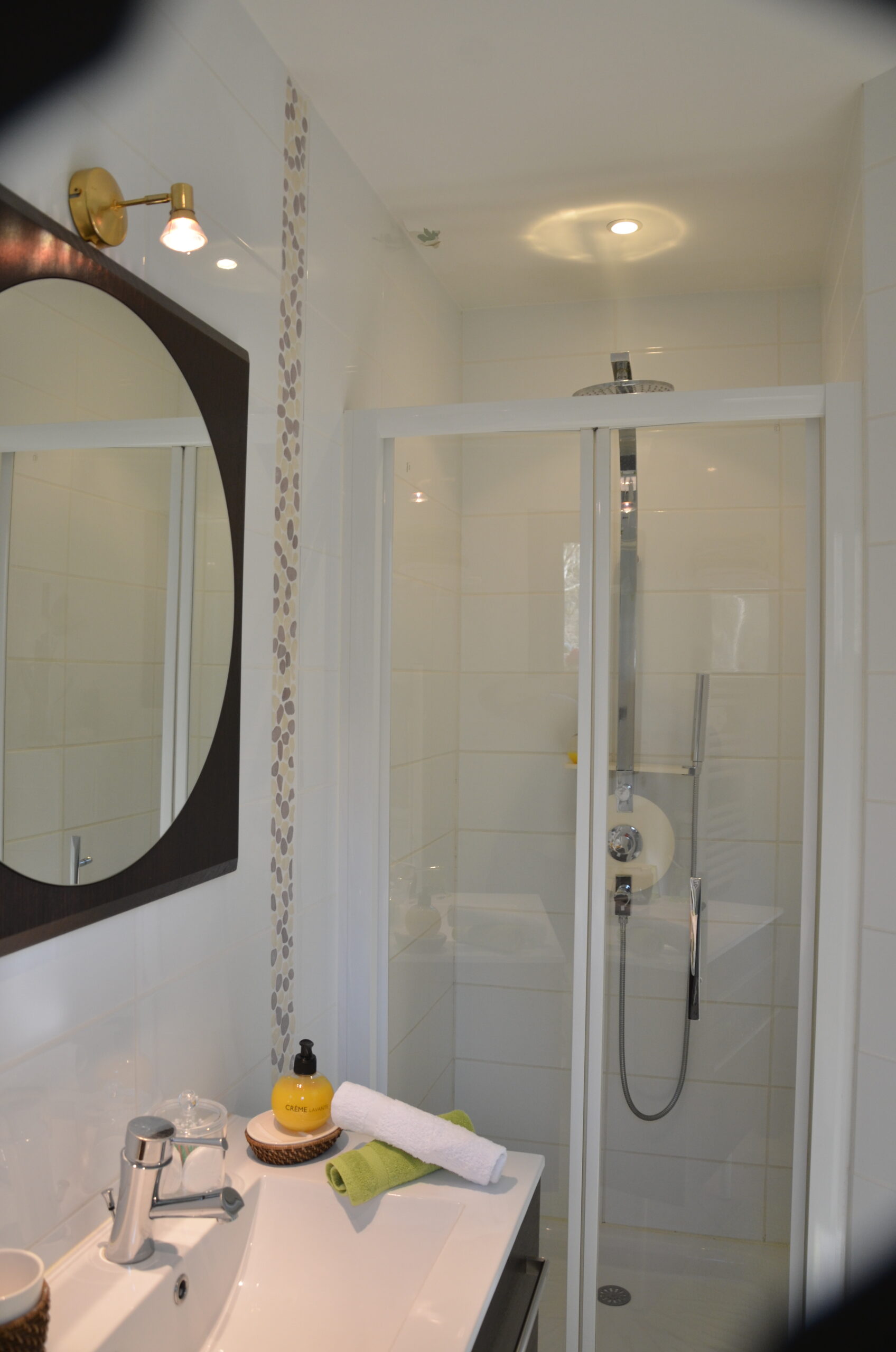 Elle dispose d’une douche moderne avec toilettes intégrées, d’un sèche-cheveux, d’un petit réfrigérateur, et d’un plateau de courtoisie avec café, thé et eau.